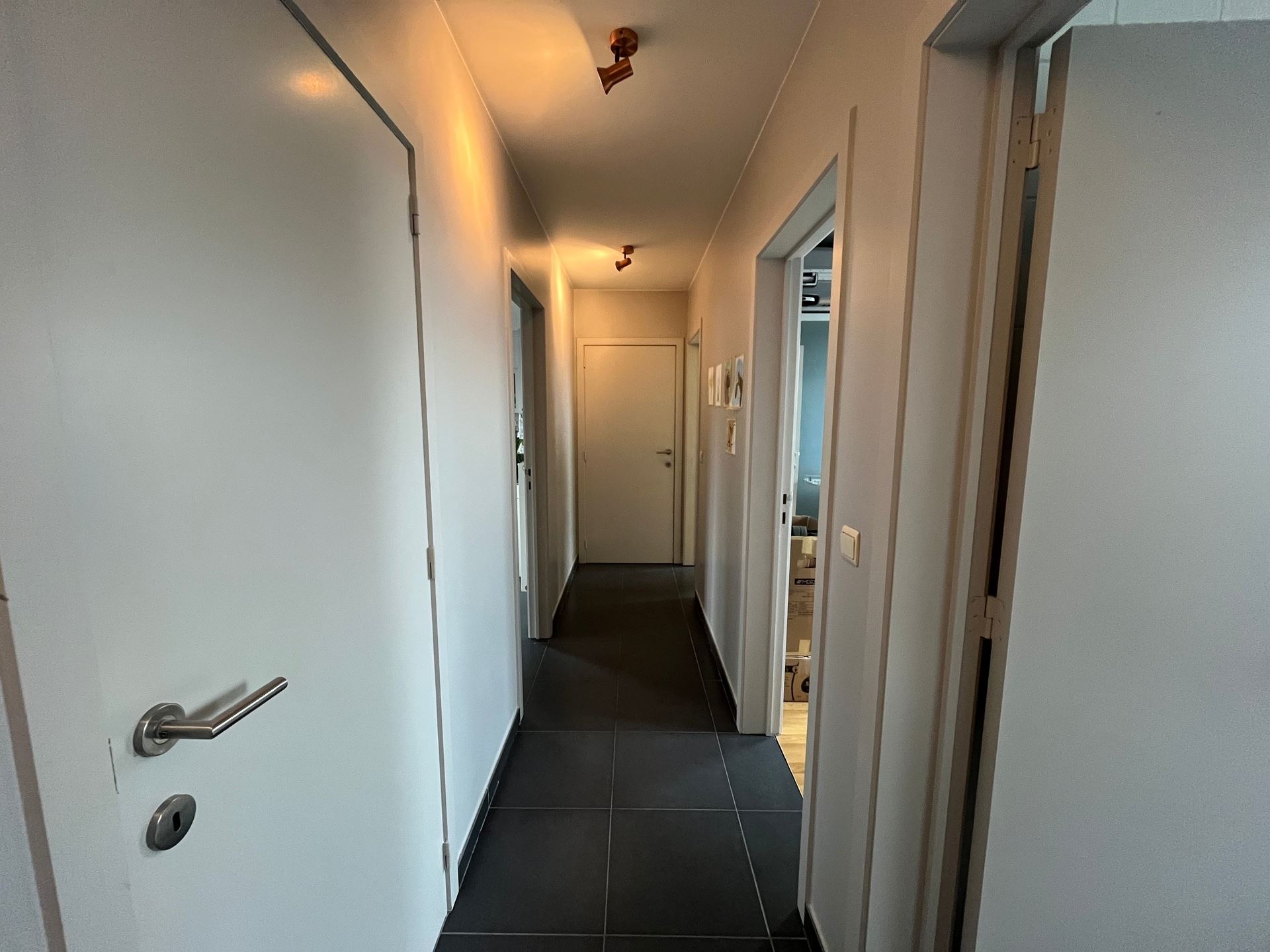 Through the entrance hall you enter the apartment. Immediately to the right is the bathroom, equipped with a shower and a double sink cabinet. Opposite the bathroom there is a separate guest toilet. In the same hall there are also the two bedrooms and a practical storage room with plumbing for a washing machine and dryer.