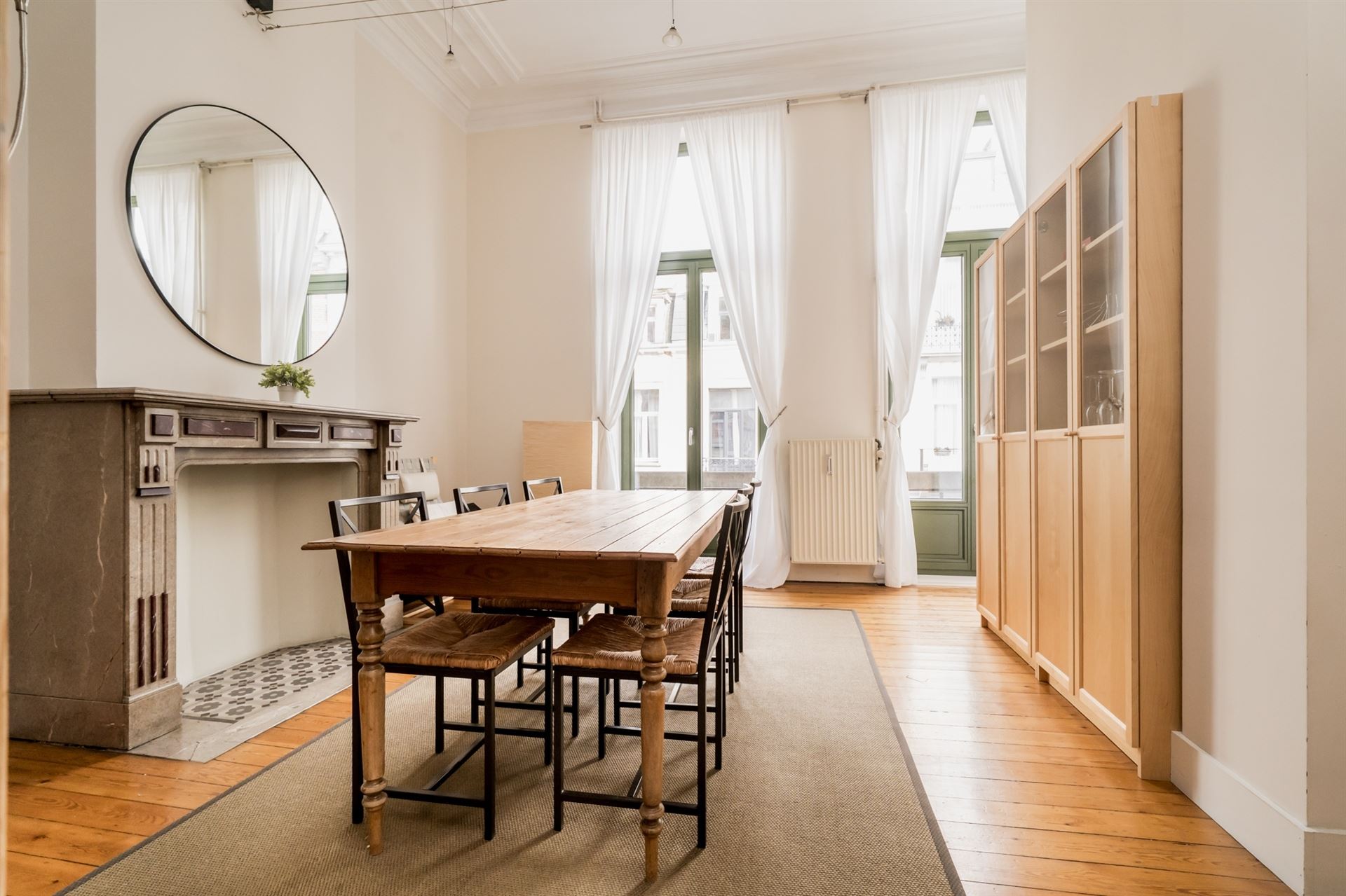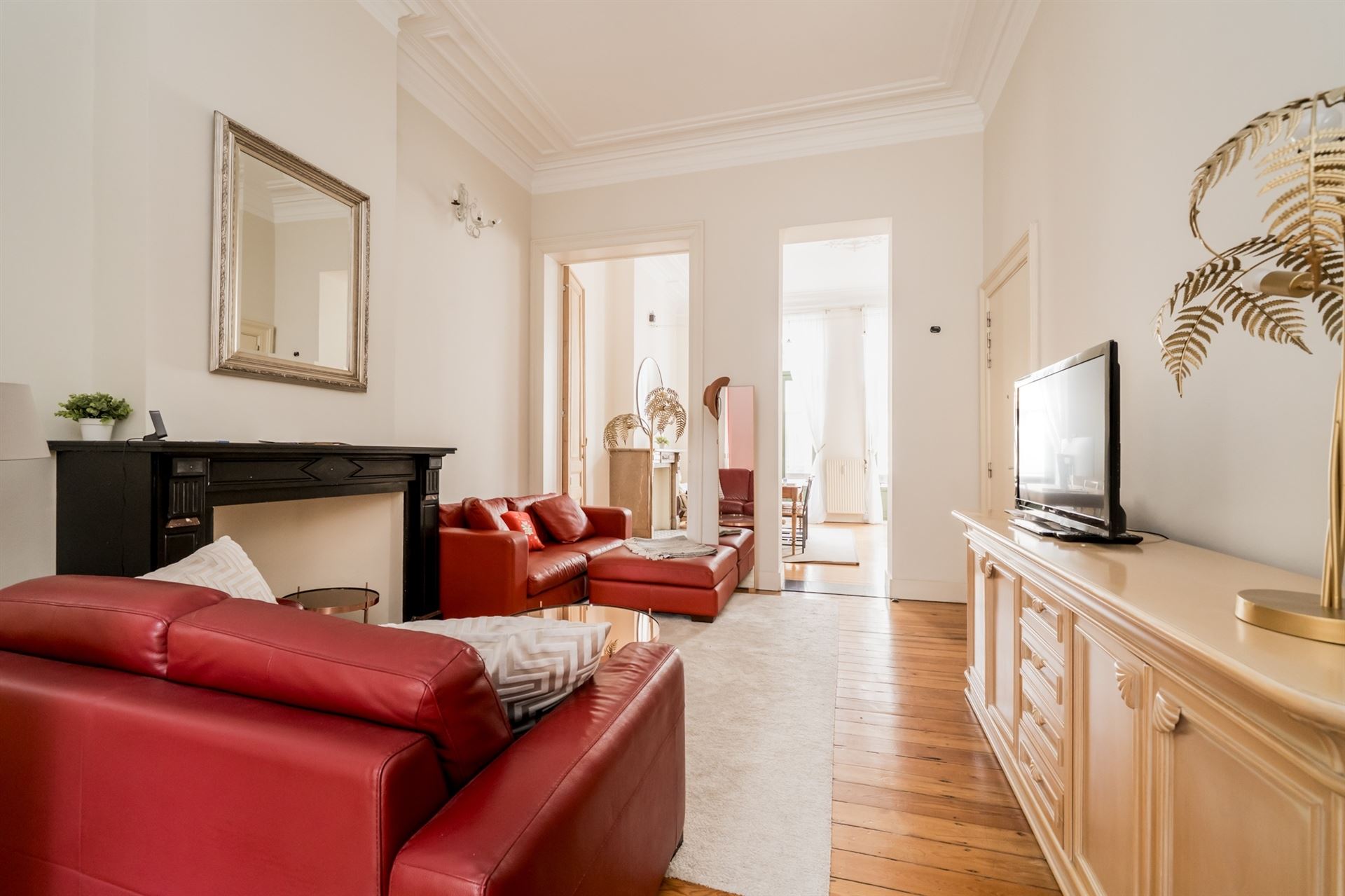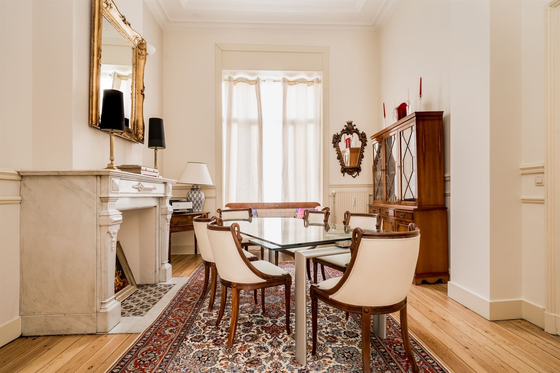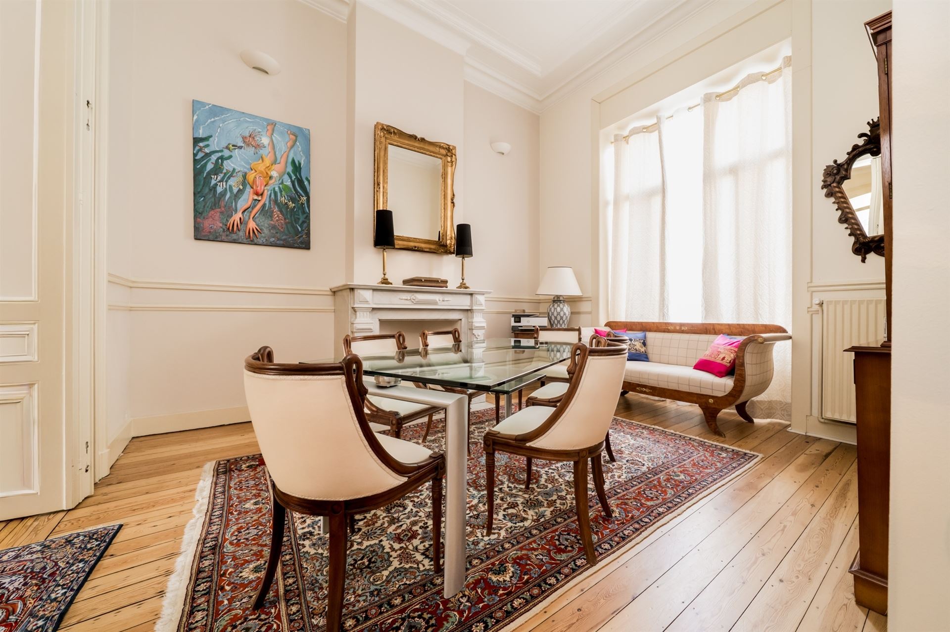 The property first features a spacious duplex apartment of approximately 176m² gross, located on the bel floor and semi-basement level. The bel floor offers three magnificent consecutive reception rooms with high ceilings and authentic character features. These spaces are currently arranged as an elegant living room, a fully equipped open-plan American kitchen with dining area and access / views over the south-facing garden (+/- 120m²). The front room facing the street can serve as a dining room and is officially recognized as a bedroom.