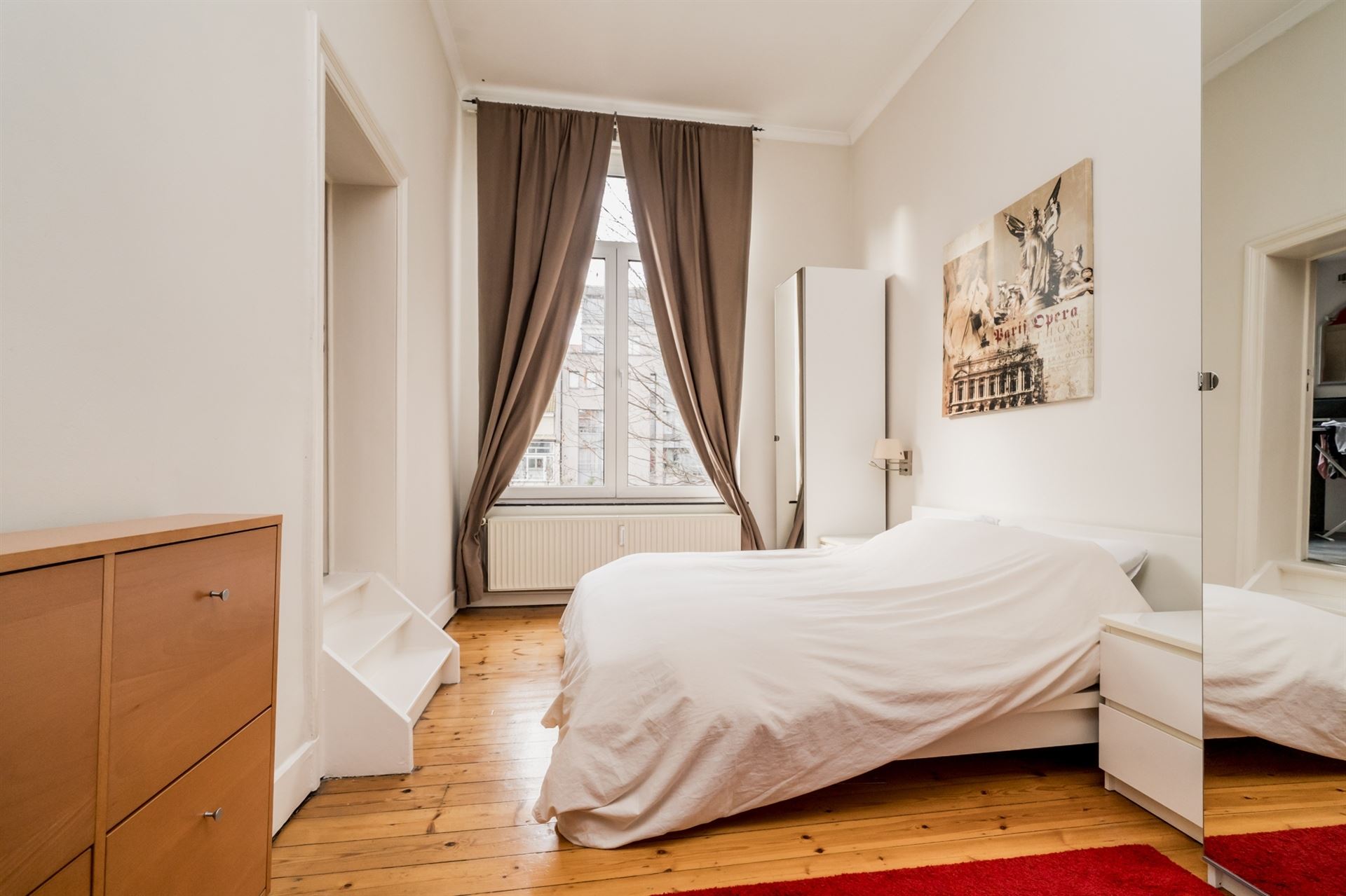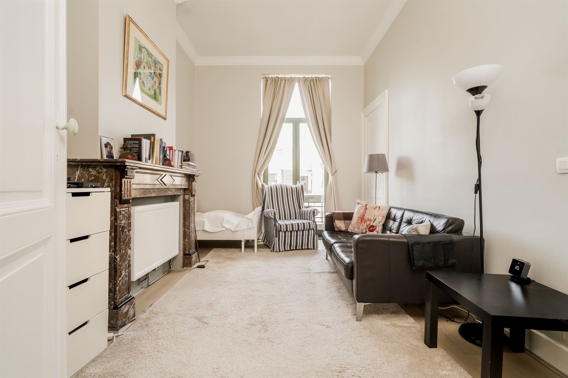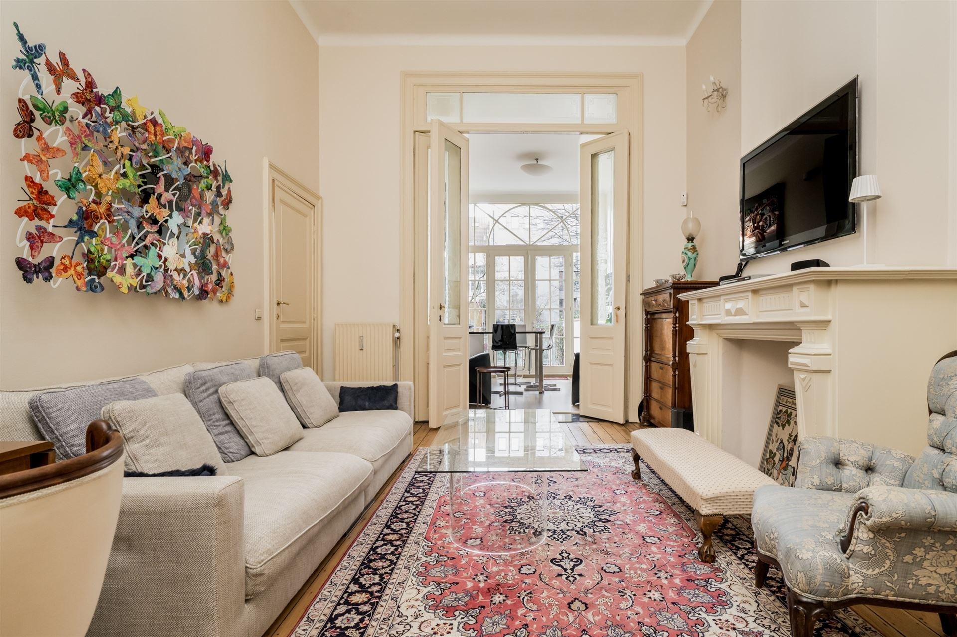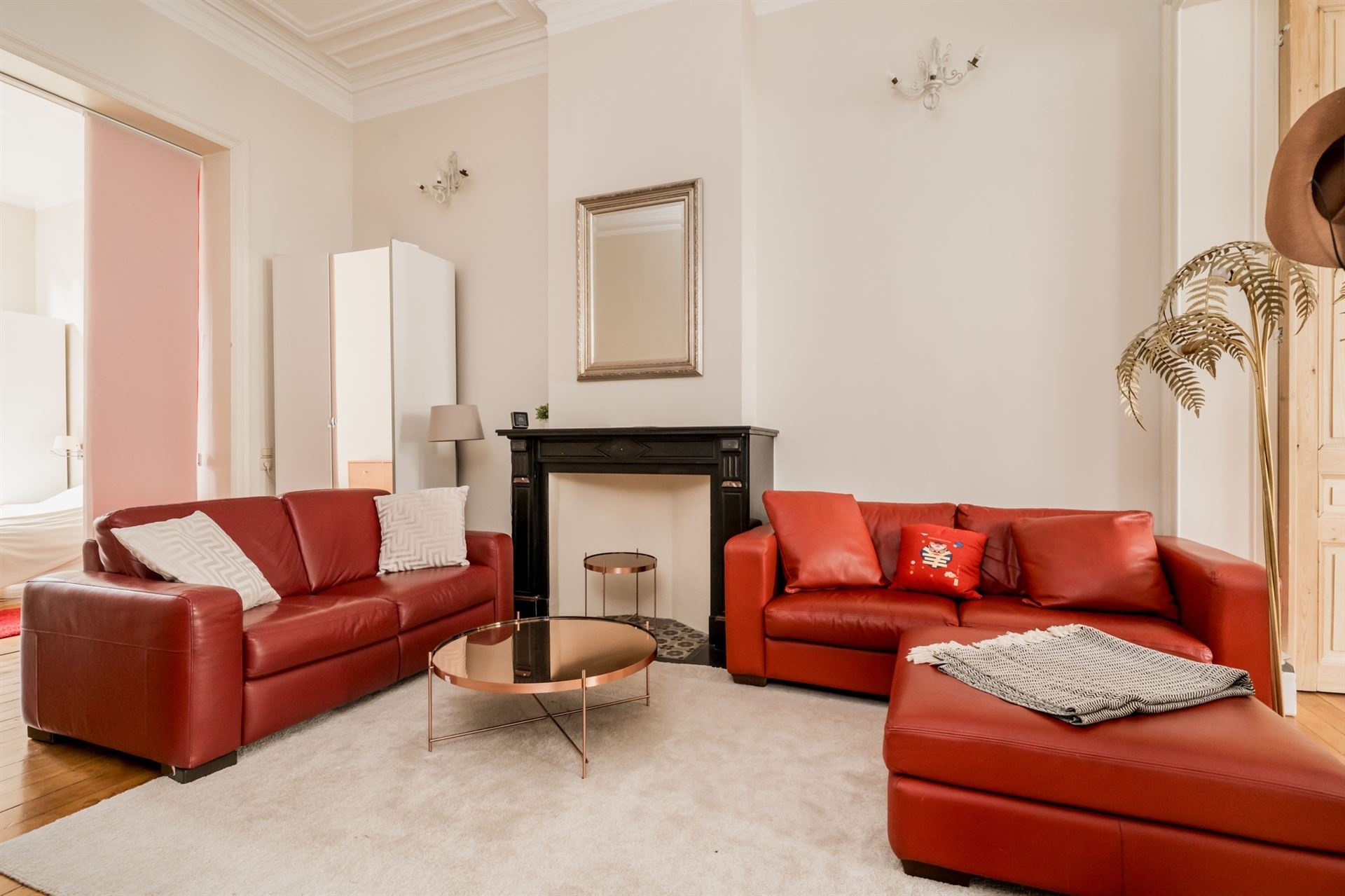 The property first features a spacious duplex apartment of approximately 176m² gross, located on the bel floor and semi-basement level. The bel floor offers three magnificent consecutive reception rooms with high ceilings and authentic character features. These spaces are currently arranged as an elegant living room, a fully equipped open-plan American kitchen with dining area and access / views over the south-facing garden (+/- 120m²). The front room facing the street can serve as a dining room and is officially recognized as a bedroom.