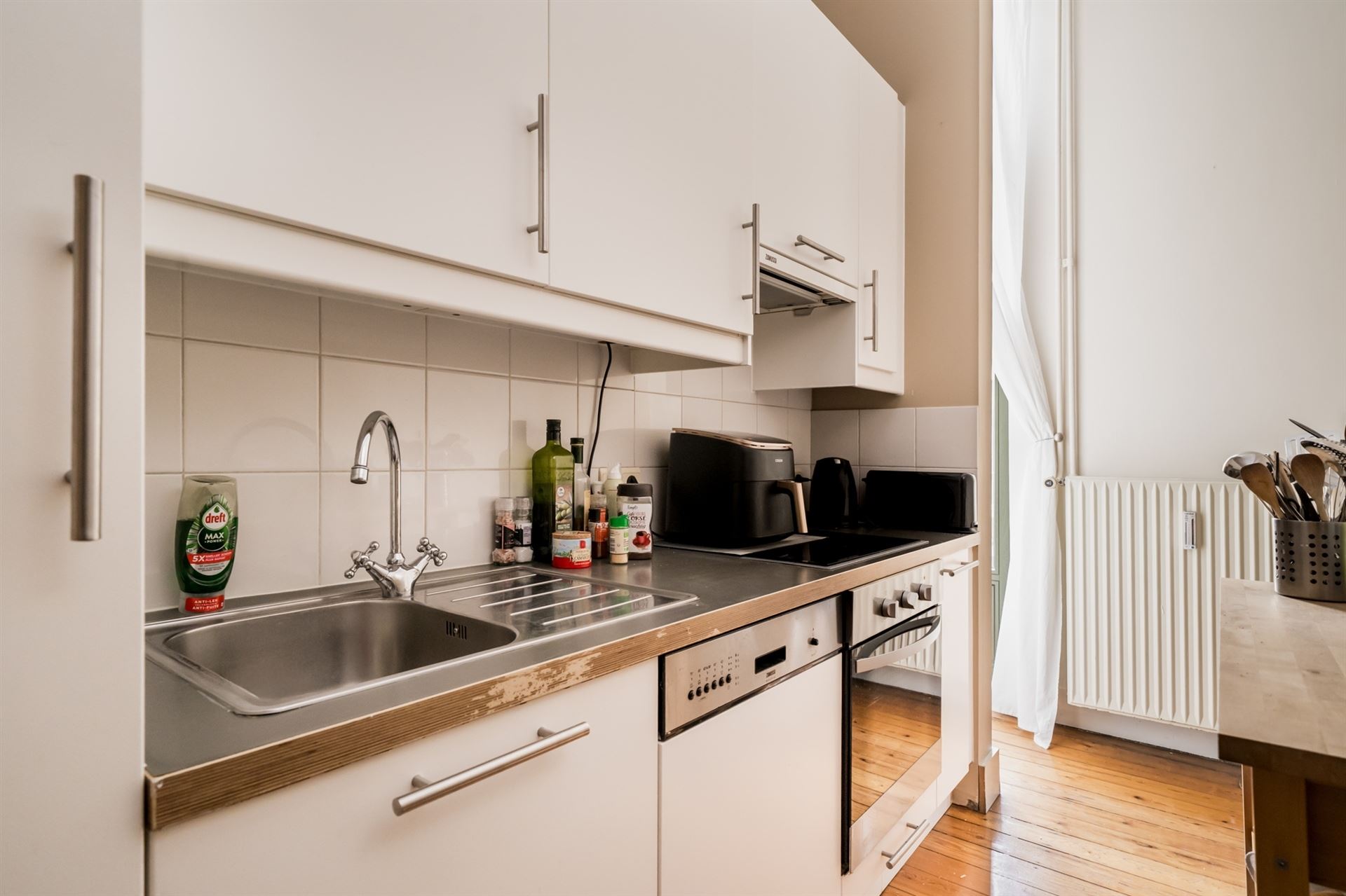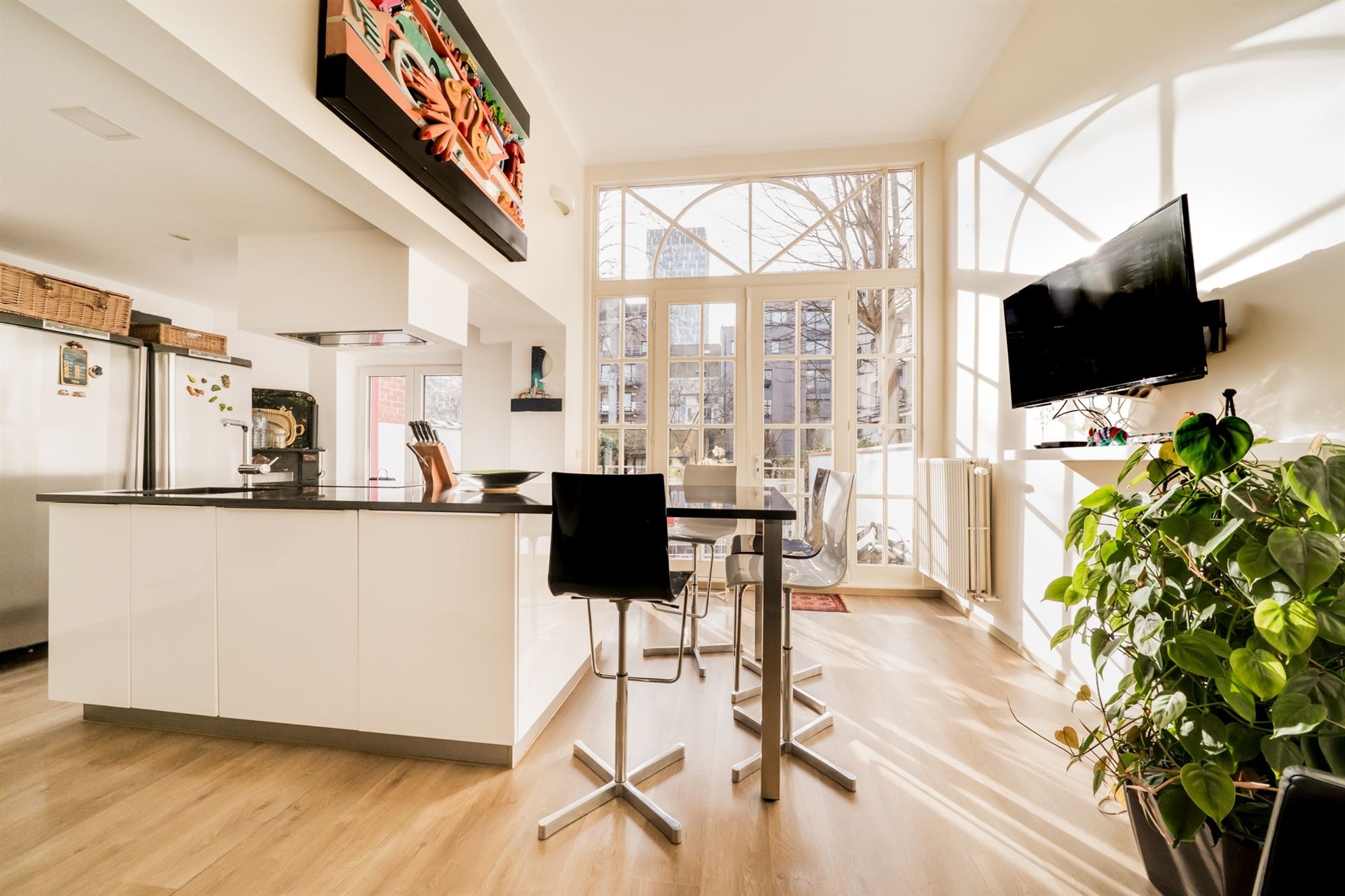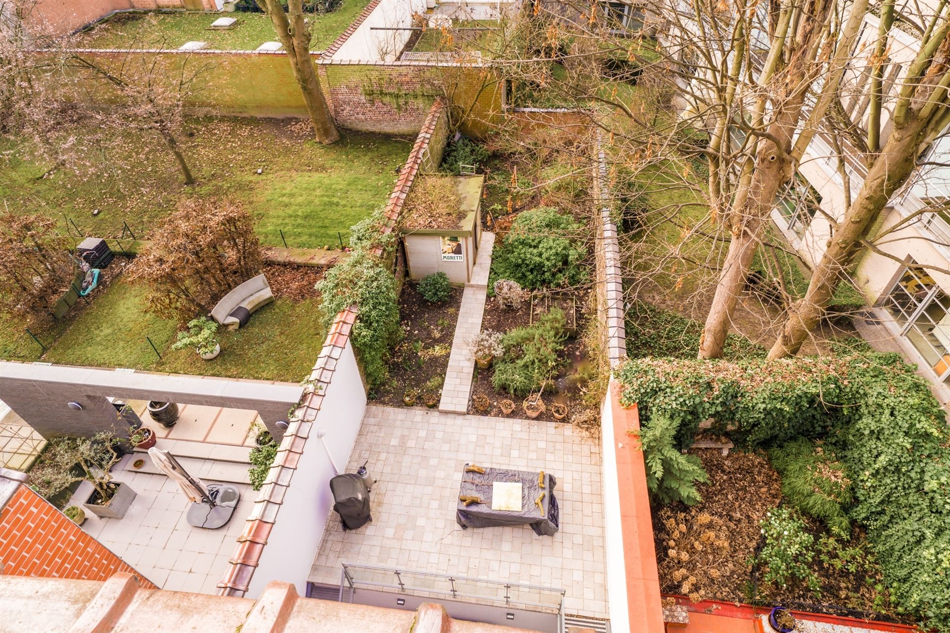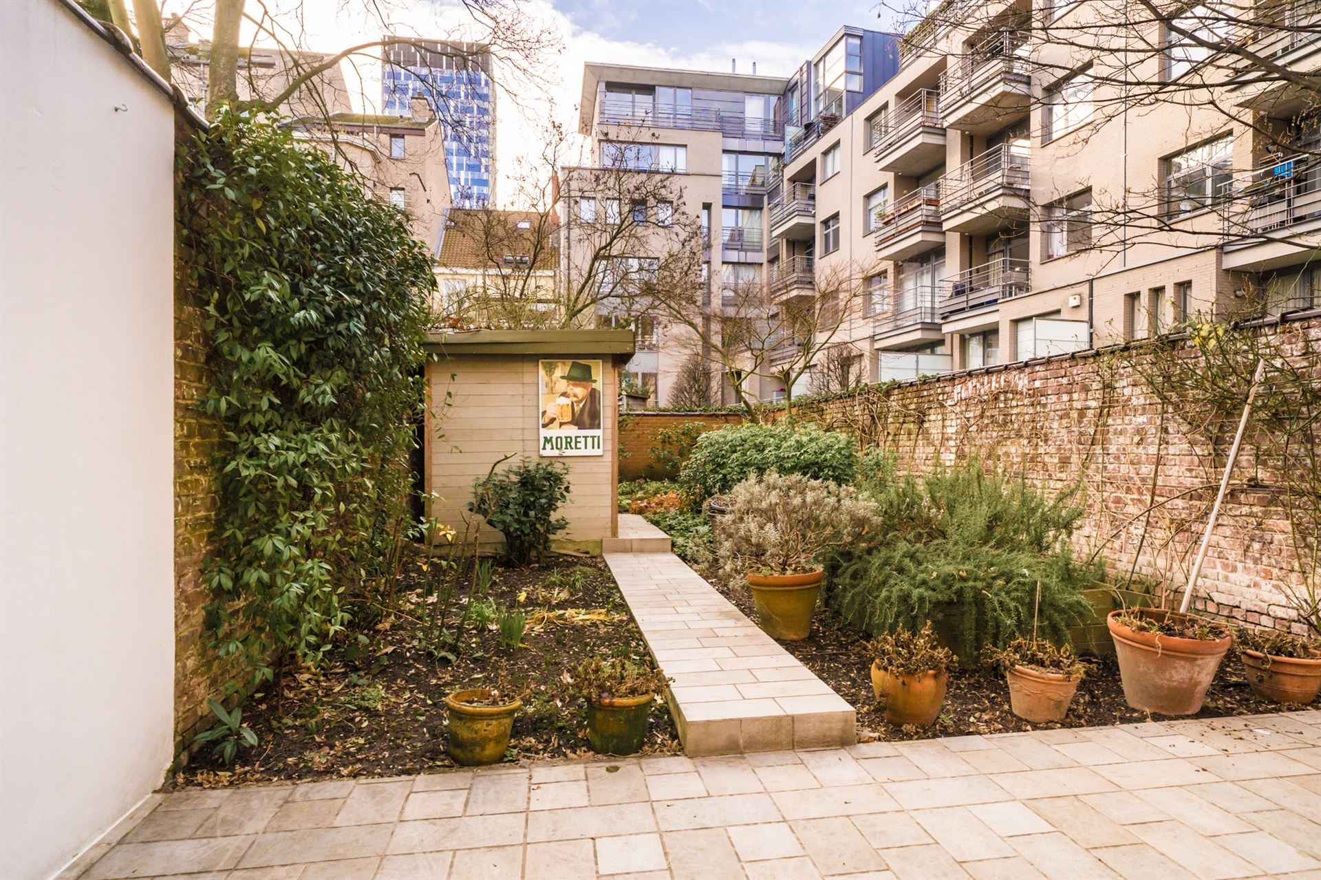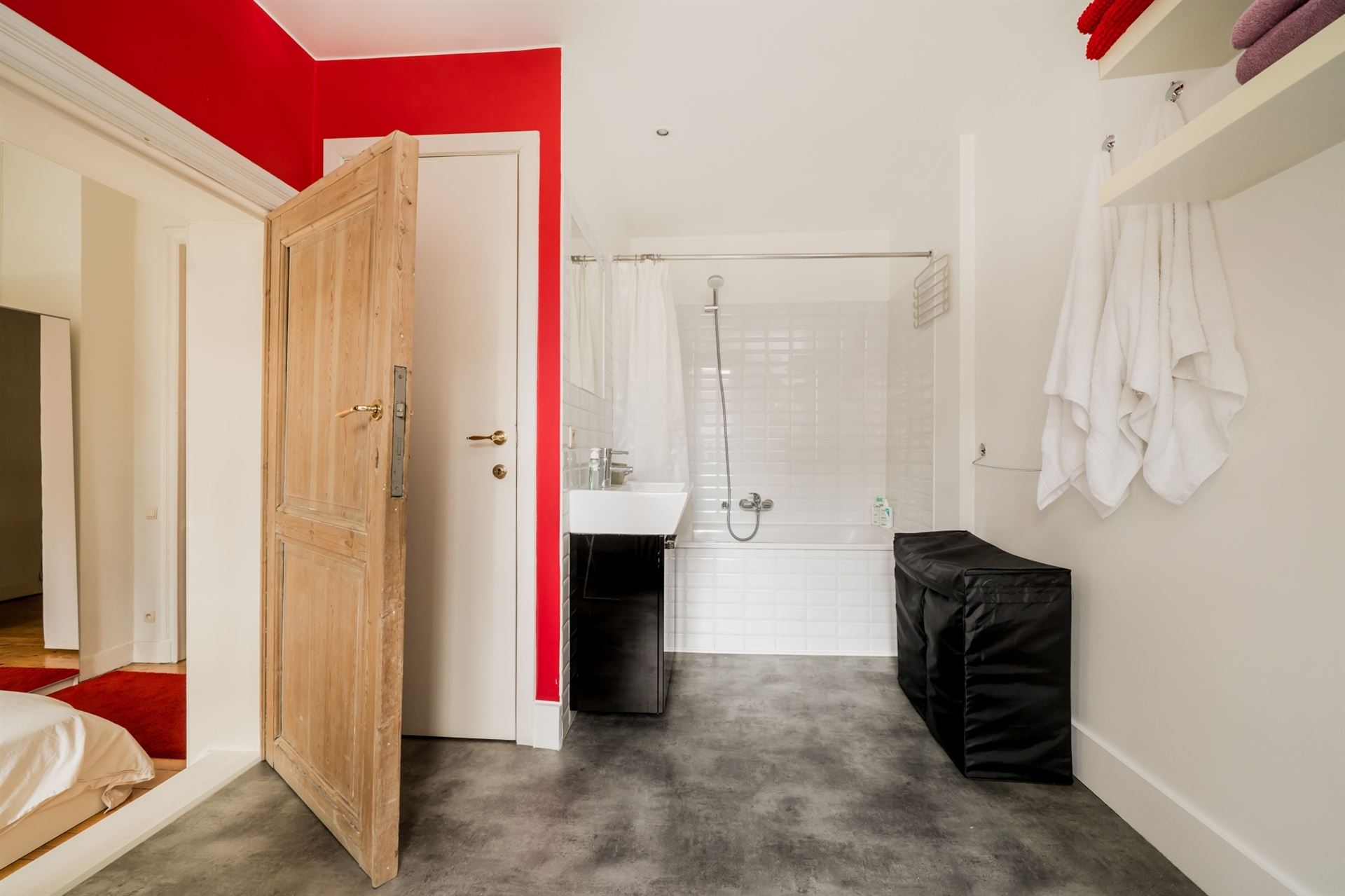 The property first features a spacious duplex apartment of approximately 176m² gross, located on the bel floor and semi-basement level. The bel floor offers three magnificent consecutive reception rooms with high ceilings and authentic character features. These spaces are currently arranged as an elegant living room, a fully equipped open-plan American kitchen with dining area and access / views over the south-facing garden (+/- 120m²). The front room facing the street can serve as a dining room and is officially recognized as a bedroom.